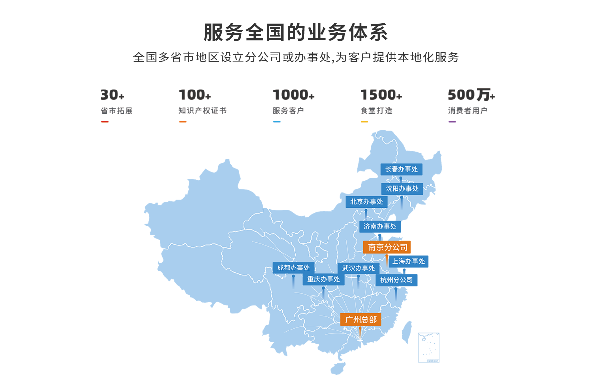 截止目前已相繼為超過1000家客戶,1500+食堂,超過500萬消費者,提供智慧食堂就餐服務,覆蓋單位、醫院、教育、交通、能源、金融、電信等眾多行業客戶群體,服務了包括國資委、舟山市政府、佛山公安局、銀川國際機場、TCL、蘇寧集團、金龍魚、阿里巴巴集團、東風汽車等知名用戶,成為農業銀行、中國移動ICT戰略合作伙伴以及華南理工大學、中山大學等知名大學智慧食堂合作伙伴,是全國智慧食堂行業領先的知名品牌。