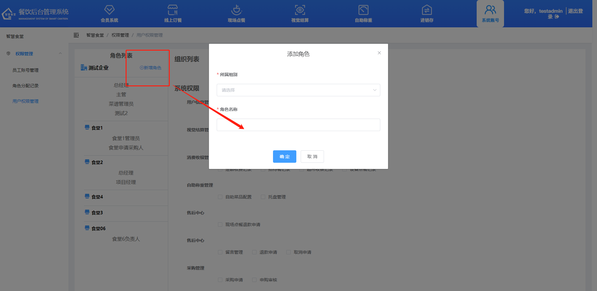 ①按需勾選“組織列表”中的食堂,擁有哪個食堂的權限則角色就可以查看和管理食堂相關模塊。