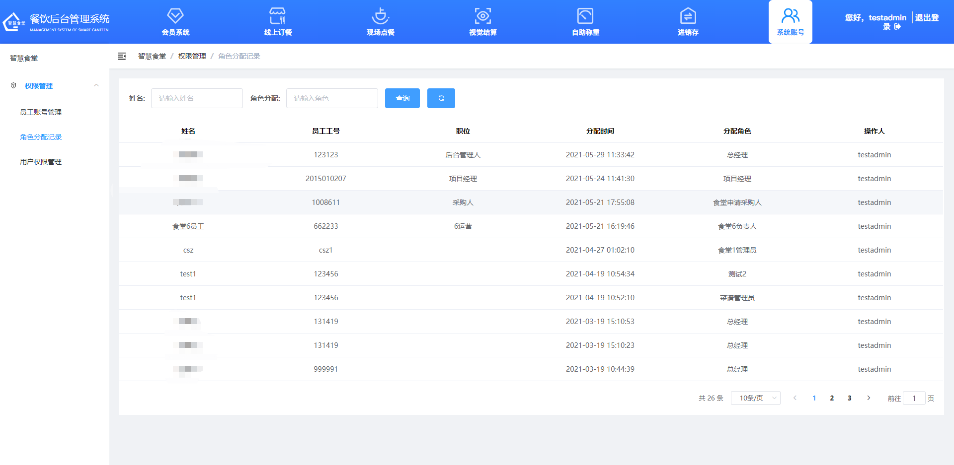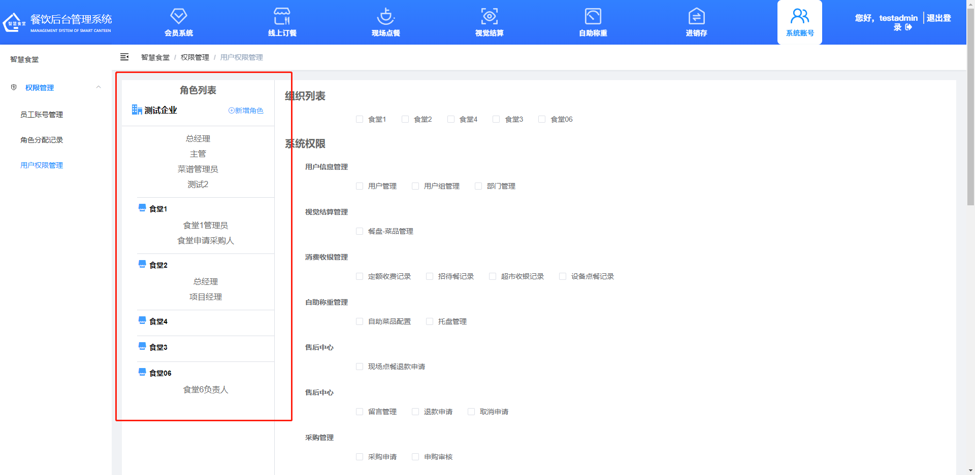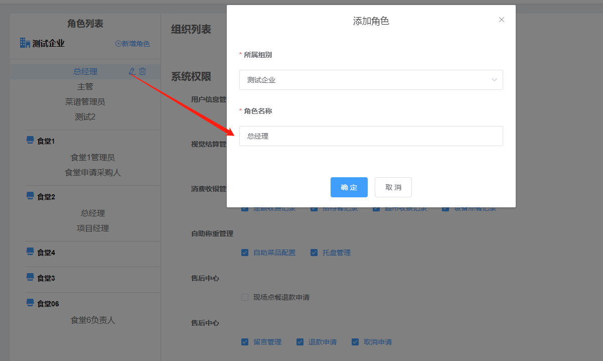 列表按不同食堂顯示角色名稱,點擊任意一個名稱,可對角色權限進行修改。
