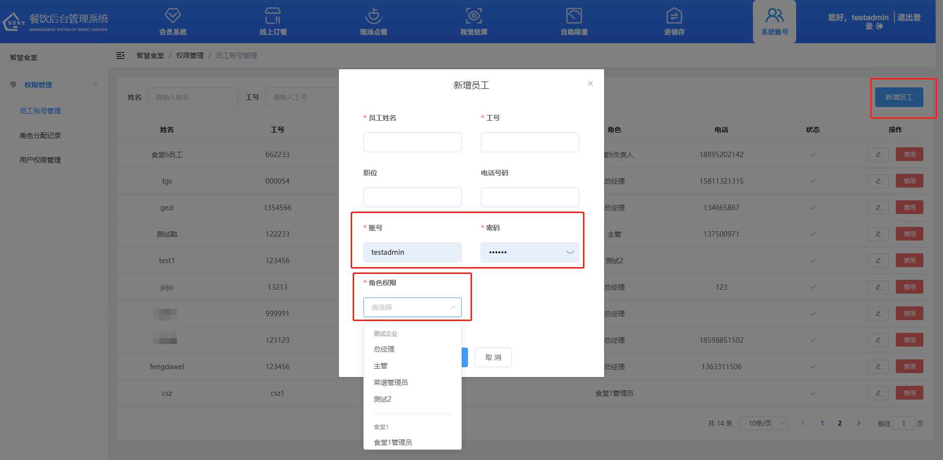 ②輸入員工姓名、工號、職位、電話號碼、賬號、密碼、角色權限等信息。