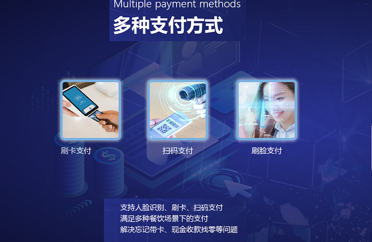 戈子科技智慧食堂可對接食堂一卡通系統(tǒng),實現(xiàn)刷卡支付;為滿足現(xiàn)代人消費習慣,戈子科技智慧食堂可使用微信、支付寶等掃碼支付;戈子科技智慧食堂同時擁有先進的金融級AI人臉識別技術,員工在后臺錄入自己的人臉信息后即可使用人臉識別支付,人臉識別支付人均用時低于0.3秒,體現(xiàn)該技術的超高速識別。多種方式聚合支付的方式大幅度降低了就餐高峰期時的排隊等待壓力,總體提升企業(yè)食堂運營效率,提高員工就餐的便利性。
