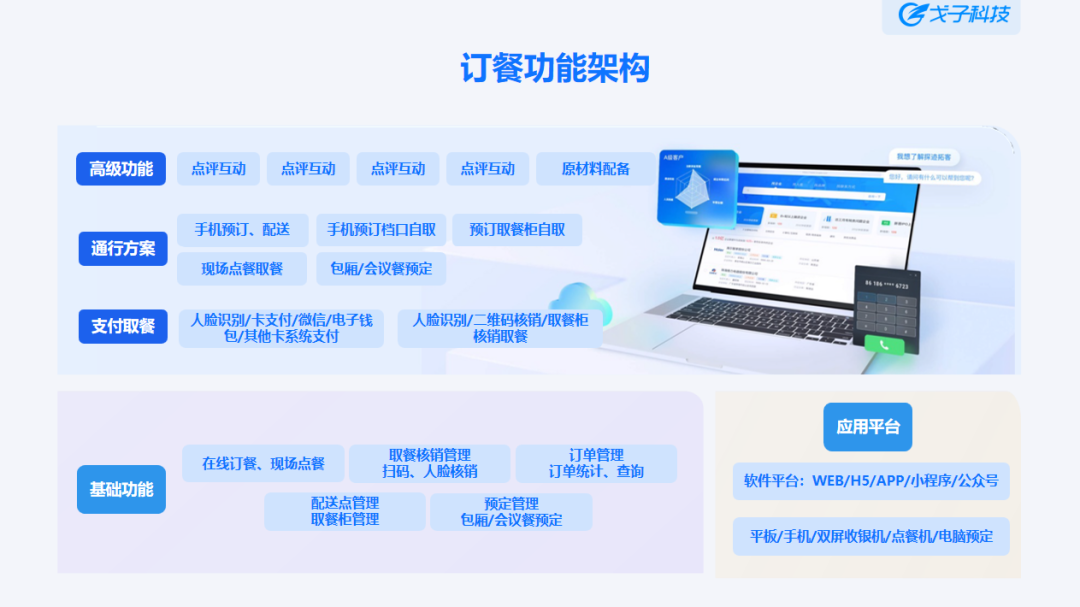 戈子科技在會上展示的戈子科技全場景解決方案以“戈子視覺結算系統”、“智能訂餐”、“智能支付”、“進銷存管理”四個模塊,細分為在線訂餐、智能支付、視覺結算、后臺管理、企業管控等方面,全面滿足企業管控,食堂運營,職工就餐的多元化,定制化需求。用“智能+全場景”的方式解決醫院、學校、企業、機關食堂管理痛點,致力于促進團餐行業新變革。